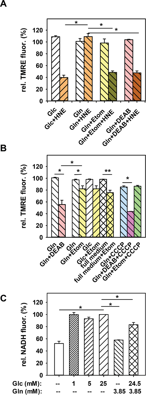 Figure 4: Dependence of the HNE-induced mitochondrial membrane potential alteration of N18TG2 cells on β-oxidation. A. In cells, incubated in 3.85 mM glutamine medium (Gln), either β-oxidation was inhibited with 100 μM etomoxir (Etom), or ALDH activity was blocked with 50 μM DEAB. Then 16 μM HNE was added for 1h. TMRE fluorescence after 1h incubation with HNE was normalized to the fluorescence before HNE addition. For comparison controls without inhibitors are shown (25 mM glucose medium (Glc) or Gln). Data are presented as mean values ± SEM for 3-10 independent experiments. B. Effect of etomoxir (Gln+Etom), DEAB (Gln+DEAB) and 1 μM CCCP on the MMP of cells in glutamine medium without HNE. Etomoxir was also added to full medium (full medium+Etom) and to cells incubated in glucose medium (Glc+Etom). White bars are controls without inhibitor. Data are presented as mean values ± SEM for 3-12 independent experiments. C. NADH levels of cells incubated in medium containing different glucose (Glc) or glutamine (Gln) concentrations. NADH fluorescence was normalized to NADH fluorescence of cells incubated 2 h 30 min in 25 mM glucose medium. Data are presented as mean values ± SEM for 200 cells from 2 independent experiments. *p < 0.05, **p < 0.01.