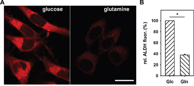 Figure 5: Nutrient dependence of AldeRed fluorescence in N18TG2 cells. A. Typical fluorescence images of cells stained for 30 min with AldeRed after 2 h 30 min incubation in 25 mM glucose (left) or 3.85 mM glutamine (right) medium. Scale bar is 20 μm. B. Comparison of the relative AldeRed fluorescence changes in cells incubated in glucose (Glc) or glutamine (Gln) medium. Measured ALDH fluorescence was normalized to ALDH fluorescence of cells incubated in glucose medium. Data are presented as mean values ± SEM for 2 independent experiments, (>600 cells analyzed). * p < 0.05.
