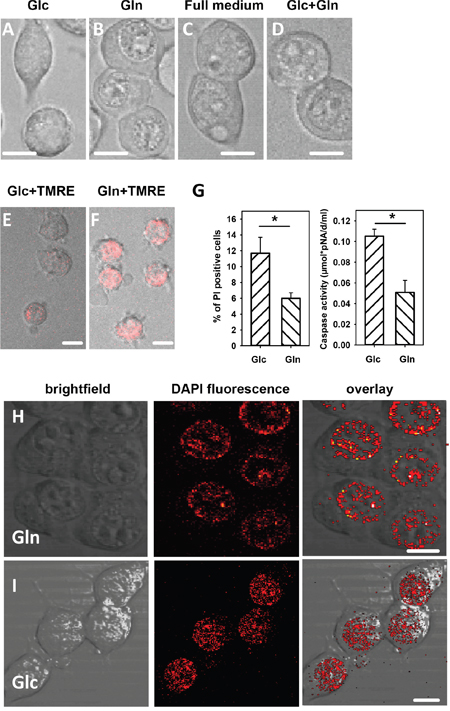 Figure 6: Morphology, viability and nucleus morphology of cells incubated in different media after addition of HNE observed with brightfield and fluorescent microscopy. Cells were incubated for 150 min in medium containing either A., E. and I. 25 mM glucose, or B., F. and H. 3.85 mM glutamine medium, or C. full medium, or D. 24.5 mM glucose and 3.85 mM glutamine. The concentration of HNE added for 1 h was 16 μM. A-D. Morphology, E and F. Reversibility of the mitochondrial membrane potential: cells were washed after HNE treatment and incubated for 3 hours in fresh medium with TMRE. G. Viability: The percentage of propidium iodide (PI) positive cells and caspase 3 activity was determined after 1 h incubation with HNE. Data are presented as mean values ± SEM for 5 independent experiments. * p < 0.05. H and I. Cell nuclei were stained with DAPI. Scale bar is 10 μm.