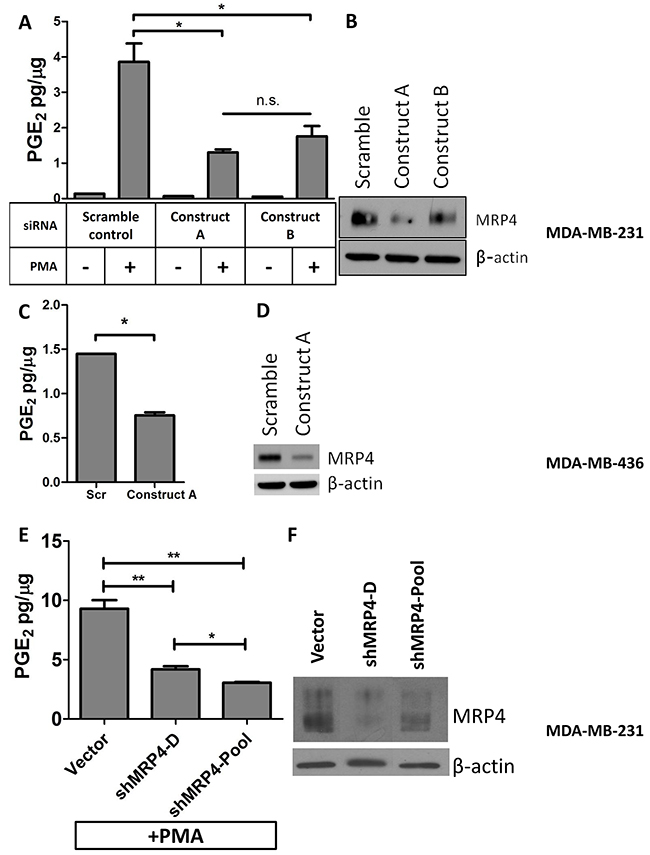 Figure 2: Knockdown of MRP4 in MDA-MB-231 and MDA-MB-436 cells suppresses the export of PGE2. MDA-MB-231 cells were transfected with MRP4 siRNA (3 nmol/L) for 24 hours before being stimulated with PMA (80 nmol/L, 1 hr) and replacing growth media. After 16 hours, conditioned media and total protein lysate was collected. A. Conditioned media from MRP4-silenced cells (MDA-MB-231) stimulated with PMA was assayed for PGE2 and total protein. B. A representative western blot of MDA-MB-231 cells transfected with siRNA (3 nmol/L) and stimulated with PMA shows decreased expression of MRP4. MDA-MB-436 cells were transfected with MRP4 siRNA (10 nmol/L). C. Conditioned media from MDA-MB-436 cells was collected after overnight incubation and assayed for PGE2 content. D. A representative western blot showing 68% decreased MRP4 expression following siRNA transfection of MDA-MB-436 cells. E. MDA-MB-231 vector control, clone (shMRP4-D), and pool (shMRP4-Pool) populations of stable MRP4 knockdown cells were briefly stimulated with 80 nM PMA and incubated overnight in fresh growth medium. Conditioned media was collected and assayed for PGE2. F. A representative western blot showing decreased MRP4 expression of MDA-MB-231 clone shMRP4-D and shMRP4-Pool cell lines compared to vector control cells. PGE2 is expressed as mean ± SEM pg/μg protein from triplicate determinations. β-actin was used as a loading control.* p < 0.05, ** p < 0.01, n.s. = not significant.