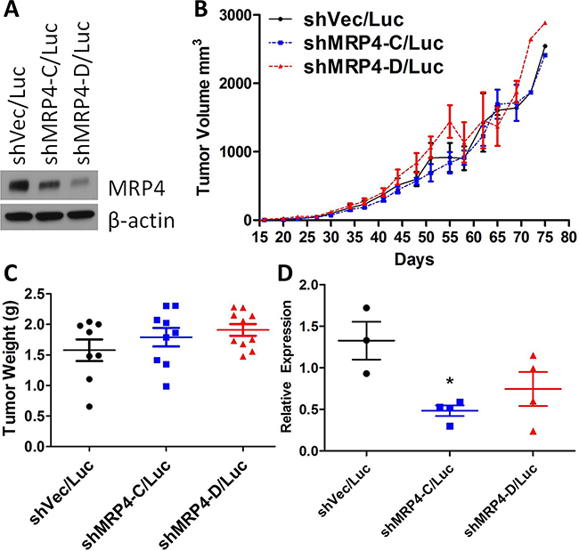 Figure 5: Subcutaneous xenografts of MDA-MB-231 shMRP4/Luc cells showed no difference in growth despite differences in MRP4 expression. A. Western blot showing relative MRP4 expression levels of vector control (shVec/Luc) and shRNA knockdown clones (shMRP4-C/Luc and shMRP4-D/Luc) prior to injection in mice. β-actin was used as a loading control. B. Tumor volume (mean ± SEM) estimated from diameter measurements of subcutaneous tumors. Volume = (long diam.)(perpendicular diam.)2(π/6). C. Weight of excised subcutaneous MDA-MB-231 shRNA/Luc tumors. D. Relative expression of ABCC4 mRNA from excised MDA-MB-231 shMRP4/Luc xenograft tumors. Each point represents one tumor sample. * p = 0.0093 compared to MDA-MB-231 shVec/Luc tumor samples.