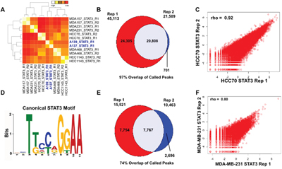 The high similarity of STAT3 binding patterns in TNBC tumors and cell lines led us to further analyze the binding patterns of STAT3 in two TNBC cell lines. Due to the heterogeneity of TNBC breast cancers, we selected two cell lines harboring broad molecular subtypes of TNBC-basal A (HCC70) and basal B (MDA-MB-231) tumors. ChIP-seq binding sites for each cell line was integrated with RNA-seq data to determine STAT3 driven gene regulation in TNBC. In HCC70, 20,808 high-confidence STAT3 binding sites were identified (Figure 1). Pairwise analysis of each ChIP-seq replicate revealed a significant correlation of binding sites across replicates (Spearman, rho=0.92) (Figure 1). These reproducible binding sites were significantly enriched for the canonical STAT3 motif (Figure 1D. Similarly, in the basal B cell line (MDA-MB-231), there were 7,767 high-confidence binding sites in both replicates (Figure 1). Again, these binding sites had both a high correlation coefficient (Spearman, rho=0.80), and a significant enrichment of the canonical STAT3 motif (Figure 1). The high-confidence binding sites for both cells lines were used for integration with RNA-seq data to characterize the effects of STAT3 binding on gene expression.