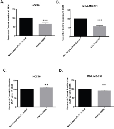 Our results suggest a potential role for STAT3 in cellular invasion and migration in TNBC. We further investigated its role in invasion in HCC70 and MDA-MB-231 cells by siRNA-mediated knockdown of STAT3 followed by matrigel transwell invasion assays. We observed a significant 44%(t-test, p-value<0.0001) and 42% decrease (t-test, p-value<0.0001) in invasion of HCC70 and MDA-MB-231 cells, respectively transfected with the STAT3 siRNA pool (Figure 3). The significant reduction of invasive potential in both cell lines reveals a functional regulatory role for STAT3 in the invasive properties characteristic of TNBCs. To ensure that STAT3 knockdown did not simply result in reduced overall viability of the cells, we also performed cellular proliferation assays, but did not observe significant differences in the viability of HCC70 or MDA-MB-231 cells, even after 96 hours of STAT3 knockdown treatment (Figure 3). Collectively, these data support a unique role for STAT3 in cellular invasion and migration.