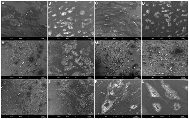 Figure 1: HR-SEM analyses. HF control at 24 h (Bar: 10 µm) A. Flat and elongated morphology (arrow). MG-63 control at 24 h (Bar: 10 µm) B. Polygonal morphology (star). HFs C. and MG-63s D. after 24 h of co-culture (Bar: 10 µm). HFs E. and MG-63s F. after 48 h of co-culture. Loss of fibroblast orientation (E., arrow); reduced MG-63 proliferation (Bar: 100 µm) and formation of clusters (F., stars). HFs G. and MG-63s H. after 72 h of co-culture (Bar: 100 µm). MG-63 invasion of HF space (H., stars). HFs I. and MG-63s J. after 96 h of co-culture (Bar: 100 µm). Overlap of MG-63s with HFs (I., arrow). Detail of MG-63s at 96 h of co-culture K. Pseudopod protrusions (stars) and pre-uropod region (arrow) (Bar: 10 µm). Detail of MG-63 control at 96 h (Bar: 10 µm) L.