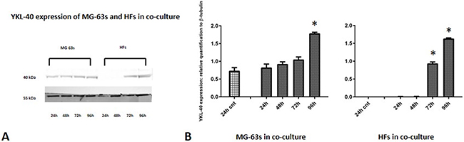 Figure 5: Western blot for YKL-40. Densitometric analysis A. YKL-40 expression in co-cultured HFs and MG-63 cells B. * represents a difference between co-cultured cells and HF or MG-63 cells alone. P<0.05.