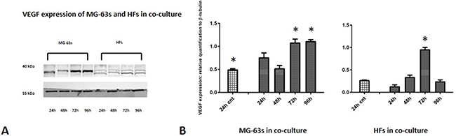 Figure 6: Western blot for VEGF. Densitometric analysis A. VEGF expression in co-cultured HFs and MG-63 cells B. * represents a difference between co-cultured cells and HF or MG-63 cells alone. P<0.05.