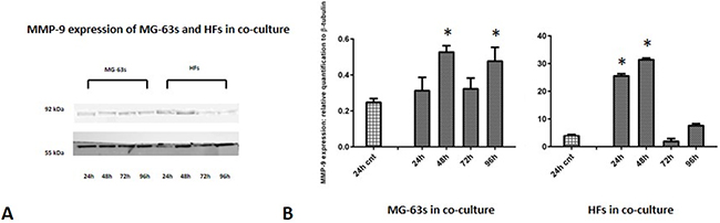 Figure 7: Western blot for MMP-9. Densitometric analysis A. MMP-9 expression in co-cultured HFs and MG-63 cells B. * represents a difference between co-cultured cells and HF or MG-63 cells alone. P<0.05.