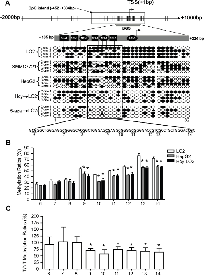 The specific conversion of elevated Hcy level to SAH further inducing DNA hypomethylation represents a major mechanism [8]. Indeed, intercellular Hcy level was inversely correlated with 5-methylated cytosine level in HCC tissue (r = -0.346; Supplementary Figure 2B). We also found that Hcy treatment could mimic 5-aza, a DNA methyltransferase inhibitor, thereby promoting global DNA demethylation and upregulating CYP2J2 (Supplementary Figure 2A, 2C). To explore whether Hcy-induced epigenetic alteration activates CYP2J2 transcription, we used bioinformatics (http://www.urogene.org/cgi-bin/methprimer/methprimer.cgi) and analysed the sequence characteristics of the 5’-flanking region (-2000-+1000 bp) of the CYP2J2 gene (Figure 3A). We identified abundant CG dinucleotides and one CpG island spanning −452 to +384 bp. Furthermore, bisulfite sequencing assay revealed that DNA methylation of the CYP2J2 core promoter (−185 to +234 bp) changed from hypermethylated in LO2 cells (80.0%) to hypomethylated in SMMC7721 cells (51.6%) and HepG2 cells (46.9%). Treatment with Hcy or 5-aza in LO2 cells reduced DNA methylation to 39.0% and 17.2%. Specifically, the SP1-2, AP1-2 and SP1-3 binding sites on the bisulfite sequencing region (10-15th CpG sites) were largely switched from methylated to unmethylated.