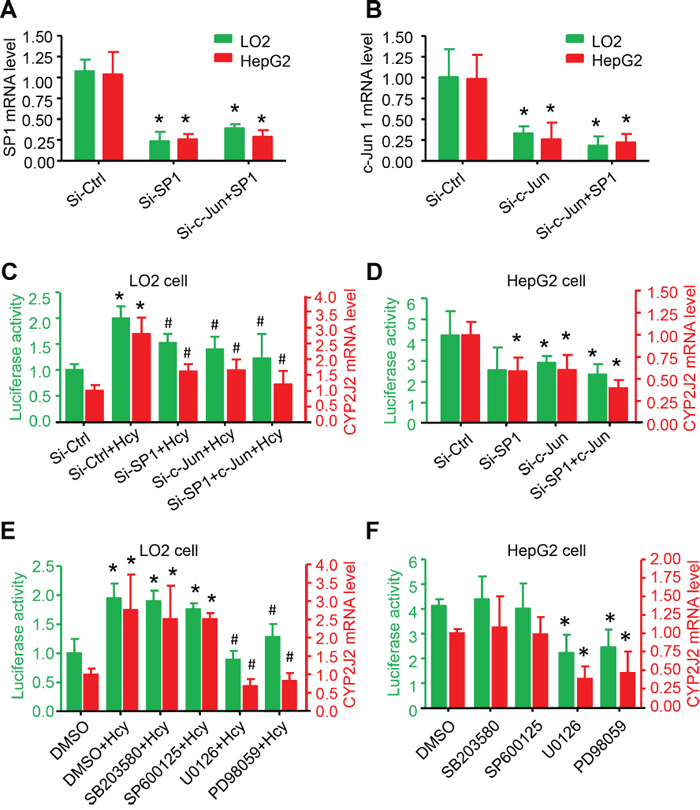 Figure 5: ERK1/2 signalling pathway participated in Hcy upregulating CYP2J2 promoter activity and expression. qRT-PCR and relative luciferase activity assay of SP1 A., c-Jun B. and CYP2J2 mRNA expression and transcriptional activity (CYP2J2+1000/-100 bp-Luciferase reporter vector), respectively, with 40-nM siRNA targeting SP1 and c-Jun for 48 h: treatment with MAPK inhibitors (PD98059, U0126, SP600125 and SB203580) for 1 h with or without Hcy treatment in LO2 cells C, E. and HepG2 D, F. cells. β-actin was an internal control for qRT-PCR assay. Data are mean±SD (n=3). *P<0.05 vs. Ctrl; #P<0.05 vs. Hcy.