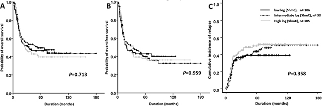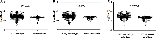 We examined the prognostic implications and clinical significance of changes to 5hmC levels as a result of TET2 or IDH1/2 mutations. The log(5hmC) levels were found to be inversely correlated with age, white blood cell (WBC) count, and the percentage of blasts in bone marrow. Patients with TET2 or IDH1/2 mutations had significantly lower levels of log(5hmC) than patients without any TET2 or IDH1/2 mutations. However, when we sub-categorized the levels of 5hmC into tertiles, we found that low, intermediate, or high levels did not influence the achievement of CR. Furthermore, relapse risk, EFS, and OS were not found to be significantly different among the patients of any sub-group.
