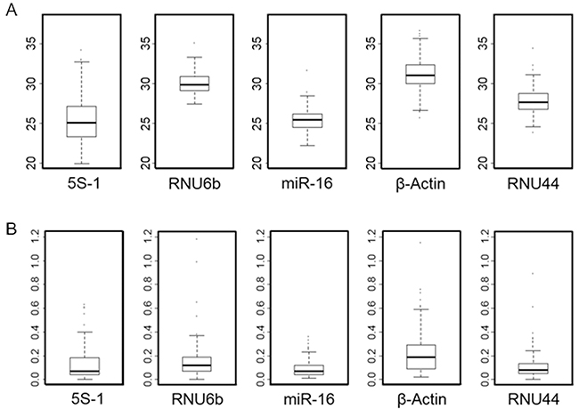One of the most important considerations for expression based biomarker analysis is to find and validate a true housekeeping gene for normalization. We have systematically searched the literature and selected several candidates for miRNA expression normalization in colorectal cancer. The candidates that we selected are ribosomal RNA 5S, RNU6b, β-actin, RNU44 and miR-16. Based on the expression profiles of these genes from 200 colorectal cancer samples, we show that miR-16 is the best housekeeping gene for miRNA expression analysis (Figure 1). The relative CT values of gene expression were listed in Figure 1A. Our results show that miR-16 is relatively more abundant than the other housekeeping gene candidates. The standard deviation of the expression of each potential housekeeping gene are listed in Figure 1B. We have previously used RNU44 as a normalization control and RNU44 is also a good housekeeping gene with lower standard deviation than miR-16. However, due to its relative low expression levels compared to miR-16, we chose miR-16 as the best housekeeping gene for this study.