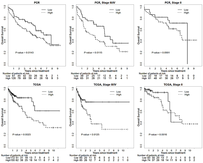 Overall survival (OS) was defined as the time from the date of diagnosis to the last follow-up date or the date of death whichever occurred first. Progression free survival (PFS) was defined as the time from the date of diagnosis to the last follow-up date or the date of death or the date of recurrence whichever occurred first, and only being alive at the last follow-up date was considered as censored. Normalized expression levels were defined using the 2-ΔΔCT method with miR-16 used as housekeeping control gene. Each miRNA’s expression was dichotomized into low and high expression using a cutoff value in the expression level which gave the smallest p-value to test if the specific miRNA expression was associated with survival outcomes based on multivariable Cox proportional hazard model after adjusting for age at diagnosis and cancer stage. Estimated hazard ratios and their 95% confidence intervals for each miRNA between low expression and high expression were reported for both OS and PFS. Stratified analysis for early stage (stage II) and advanced stage (stage III, IV) were performed. TCGA data were analyzed similarly. Statistical analysis was performed using SAS 9.3 (SAS Institute, Inc., Cary, NC) and Kaplan-Meier curves were estimated using R i386 3.3.0. Statistical significance was set at 0.05.