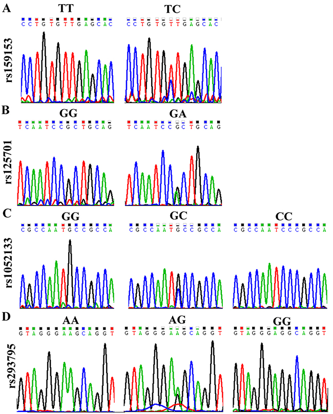 Figure 1: DNA sequencing results of a typical genotyping experiment. A. rs159153, B. rs125701, C. rs159153, and D. rs293795.