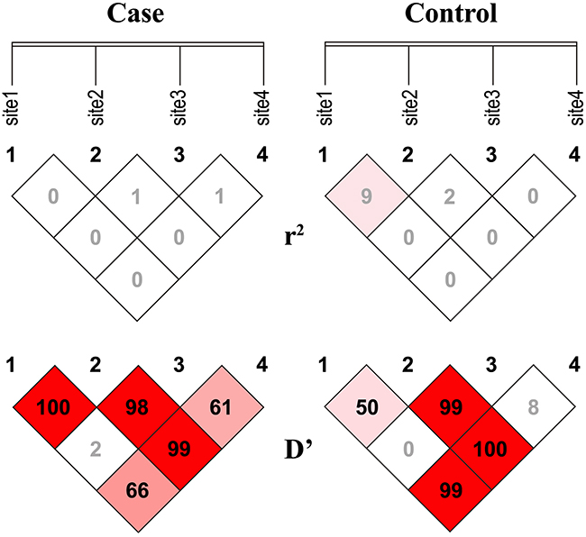 Figure 4: Pairwise LD between four htSNPs of the hOGG1 gene. The value in each diamond indicates the pairwise correlation between the tagging SNPs (measured as r2) located at the upper left and right sides of the diamond. The shading with a red-to-white gradient reflects higher to lower LD values (measured as D′).