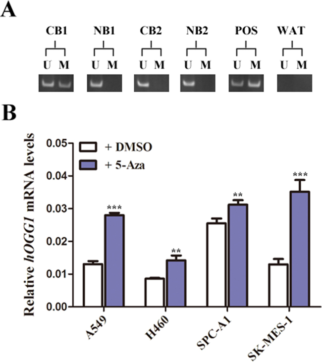 Figure 3: Methylation status analysis of hOGG1 in NSCLC. A. A schematic presentation of methylation analysis of the hOGG1 gene promoter, based on MSP of cancer patients’ blood (CB) and normal blood (NB). POS, positive methylation; water, negative control. The presence of a PCR product in lane U indicates an unmethylated status, while M indicates a methylated status. B. NSCLC cell lines, untreated or treated with the demethylation agent 5-aza. The cells were grown to 80% confluency and were harvested on day 7.