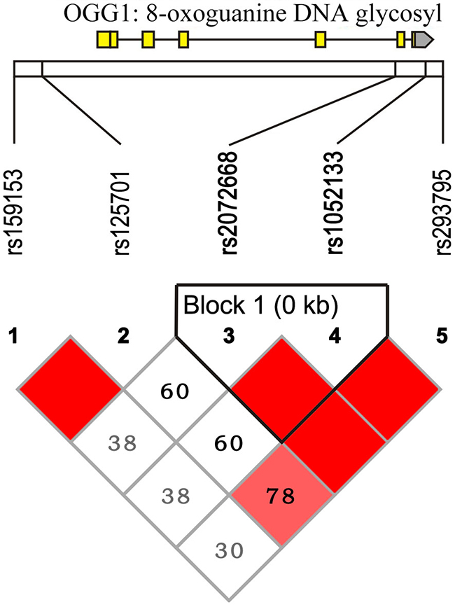 HapMap SNP Phase II data were used to determine the frequency of SNPs among Han Chinese (CHB), and five SNPs were obtained from a 15-kb region of hOGG1. One haplotype block was reconstructed from these five SNPs in the Haploview program [36]. The htSNP selection was also made in the Haploview program, through the implementation of a method proposed in our previous study [30]. A SNP was considered for inclusion in the set of htSNPs if the r2 value for its LD with at least one of the other SNPs was greater than a prespecified threshold. In our selection, only SNPs with minor allele frequencies greater than 10% were considered, and the threshold of pairwise LD was set as r2 = 0.8. A total of four htSNPs within one block were selected among five SNPs considered across hOGG1. The LD map of these four htSNPs is shown in Figure 4, and further information is provided in Supplementary Table S1.