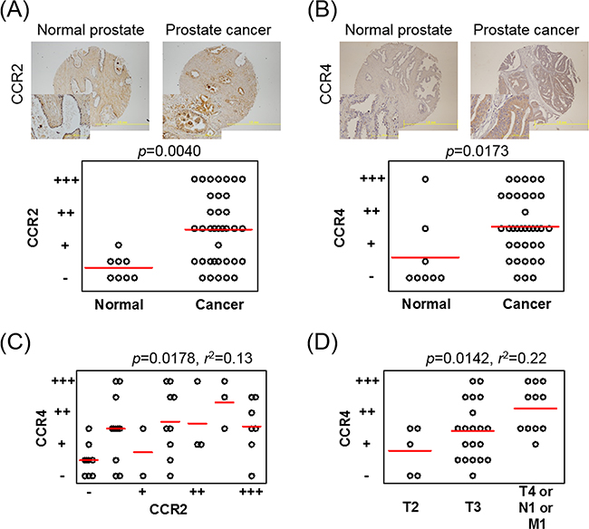 Figure 5: CCR4 and CCR2 are increased in prostate cancer tissues on IHC staining. A, B. A TMA plate containing tissue samples from 8 patients with normal prostates and tissue samples from 36 patients with prostate cancer is used, and one or two spotted tissues from each patient are placed on the plate. IHC staining of CCR2 (A) and CCR4 (B) is performed and scored on a scale from – to +++, according to intensity. Patients having two spotted tissues are scored using the average value. C. Correlation between the staining intensities of CCR2 and CCR4 in each patient is analyzed using Pearson’s correlation coefficient test. D. The CCR4 staining intensity is analyzed according to the progression of TNM stage. One-way ANOVA is performed. Bars indicate the mean of each group.