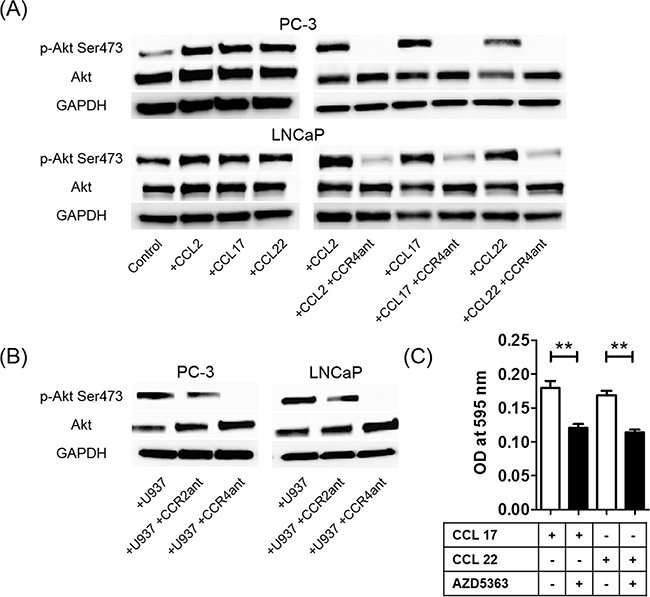 Figure 6: The CCL2–CCR2 and CCL22–CCR4 axes increase phosphorylation of Akt. A. Phosphorylation of Akt (Ser473) proteins in prostate cancer cells is assayed using western blot at 30 min after CCL2, CCL17, or CCL22 stimulation (left panels) and after CCR4 antagonist treatment with CCL2, CCL17, or CCL22 stimulation (right panels). B. U937 cell-induced phosphorylation of Akt (Ser473) proteins in prostate cancer cells with or without CCR2 and CCR4 antagonists is also assayed using western blot. Adjustments of brightness, contrast, and size are applied to the whole images of western blot-based analyses without elimination of any information present in the original, including backgrounds. C. PC-3 cells are incubated with the Akt inhibitor AZD5363 (10 μg/ml) with CCL17 (30 ng/ml) and CCL22 (30 ng/ml) for 24 h. The mean optical density (OD) value is read using a microreader at 595 nm. Data are presented as mean ± SD. All experiments are performed in triplicate, and mean values are shown. **p < 0.01. All experiments are performed in triplicate, and representative data are shown.