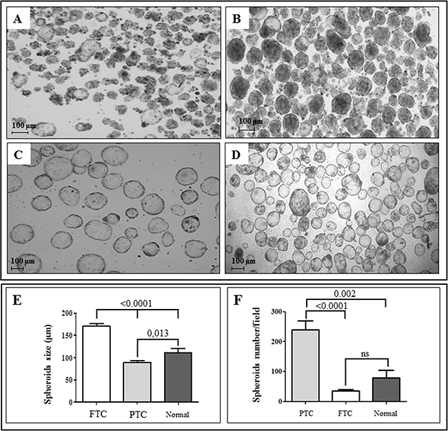 Figure 1: Thyroid spheroids derived from thyroid cancer and contralateral normal tissues are morphologically and numerically different. Spheroids display a different morphology depending on the tissue from which they have been obtained. Spheroids obtained from fresh papillary thyroid cancer after 7 days of culture in serum-free and anchorage-independent conditions may display an irregular A. or regular B. shape. On the other hand, those obtained from follicular thyroid cancer C. or normal thyroid tissue D. always show, under the same conditions, a regular and more spherical shape. Spheroids from follicular tumors and from normal thyroid tissues generally display a hollow morphology, while spheroids from papillary tumors show a more solid pattern (Original magnification, 50X). Moreover, spheroids derived from follicular thyroid cancers (FTC) are usually larger than those from papillary tumors (PTC) and normal thyroid tissues E. while the number of spheroids/well is significantly higher for those derived from PTC with respect to those derived from FTC or normal tissues F. Values are given as mean ± SEM from different preparations from independent patients. Spheroids size was calculated using AxioVision software rel. 4.8, while spheroids/well were counted using a Leica DMD108 digital microimaging instrument, considering three fields for each preparation.