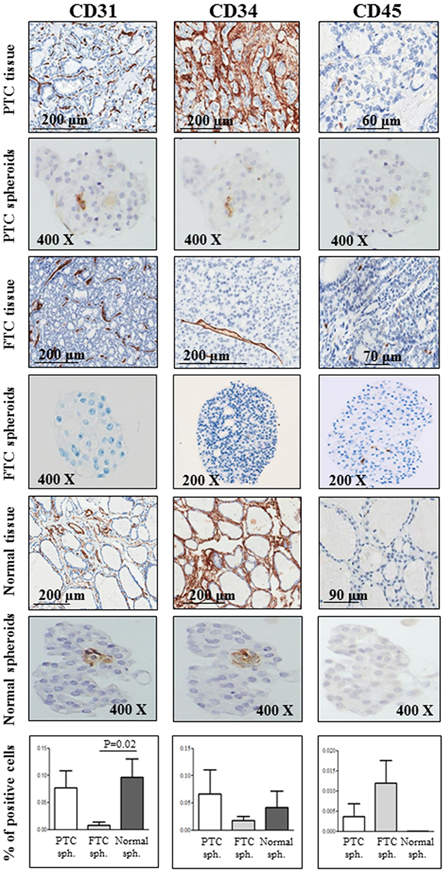 Figure 3: Endothelial and hematopoietic markers are expressed in PTCs, FTCs and normal thyroid tissues and in the derived spheroids. A strong staining for the hematopoietic/endothelial marker CD34 and the endothelial antigen CD31 is observed in both papillary thyroid cancer (PTC) and normal spheroids. Interestingly, these two markers localize in the core of the spheroid. A mild or absent expression of both antigens is observed in follicular thyroid cancer (FTC) spheroids. On the contrary, the staining for the leucocyte common antigen CD45 is negative in both PTC and normal thyroid spheroids, and positive in some spheroids from FTC tissues. For CD31, CD34 and CD45, positive cells were scored out of the total cell number within at least 5 spheres for each sample (PTC, FTC and normal spheroids) and expressed as a percentage. Bars represent mean percentages ± SEM. Only significant differences are reported.