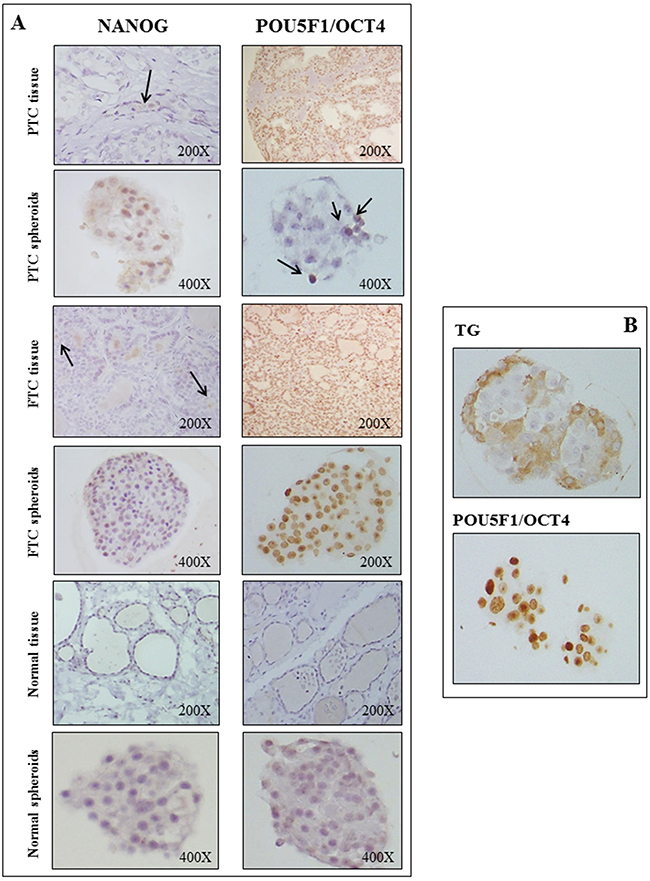 Figure 4: Embryonic stem cell markers are expressed in PTCs, FTCs and in the derived spheroids. Panel A: In PTC and FTC tissues NANOG is expressed in few cells, whereas a diffuse expression is observed in the corresponding spheroids. POU5F1/OCT4 is expressed in the majority (50-80%) of either PTCs or FTCs tissues, and its expression is maintained also in the corresponding spheroids. In normal tissues the expression of both markers is negative, while it is weak and diffuse in the corresponding normal thyroid spheroids. Panel B: The analysis for the stem cell marker POU5F1/OCT4 and the thyroid differentiation marker thyroglobulin (TG) on consecutive paraffin-embedded tumor spheroids sections shows that POU5F1/OCT4 cells mostly locate in the centre and TG cells at the periphery of the spheroids.