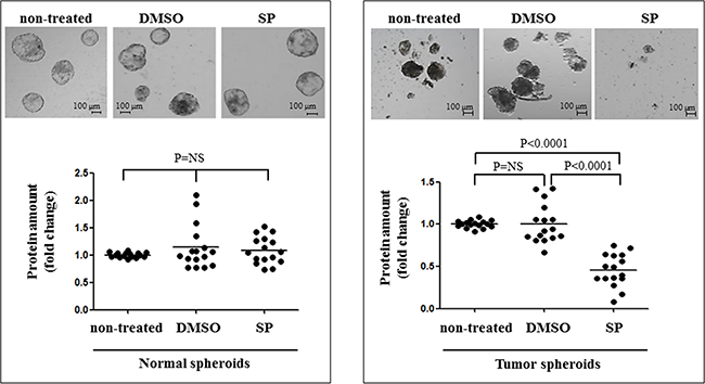 Figure 5: SP inhibits cell proliferation in multicellular tumor spheroids. In the upper panels normal and tumor spheroids are shown, either non-treated or DMSO treated (DMSO), or SP600125 (20 μM 96 hrs) treated (SP). The lower panel reports data on the cell proliferation in non-treated and treated normal and tumor spheroids. Tumor spheroids have a significant reduction in the number, the size and the total protein amount after SP treatment.