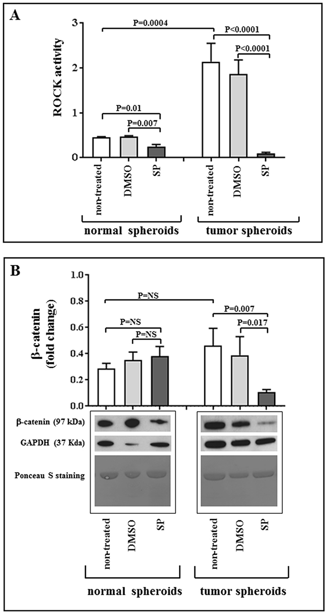 The tumor spheroids had a significantly higher ROCK activity than normal spheroids (P=0.0004, Figure 6 panel A). SP treatment was found to significantly reduce the ROCK activity in tumors spheroids and, at a lesser extent, in normal spheroids (P<0.0001 and P=0.007, Figure 6 panel A). As a second step, we examined whether these results were concordant with changes in the downstream pathway, and in particular in the β-catenin levels. Consistent with ROCK activity data, tumor spheroids showed a significant decrease in the β-catenin expression after SP treatment, whereas no differences were observed between treated and untreated normal spheroids (Figure 6, panel B).