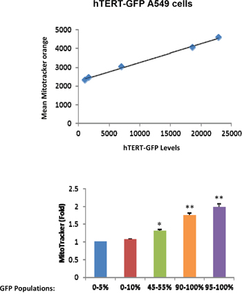 Figure 3: hTERT-high cells show a significant increase in mitochondrial membrane potential/activity. Cell populations were analyzed as outlined in Figure 2, except that MitoTracker Orange was used as a marker of mitochondrial membrane potential. Note that in A549 cells, mitochondrial membrane potential increases with increasing GFP levels. Therefore, higher telomerase activity correlates with increased mitochondrial membrane potential in A549 cells. N=3 independent experiments, 2 technical replicates per experiment. Bar graphs are shown as the mean ± SEM; t-test, two-tailed test *p < 0.05, **p < 0.001.