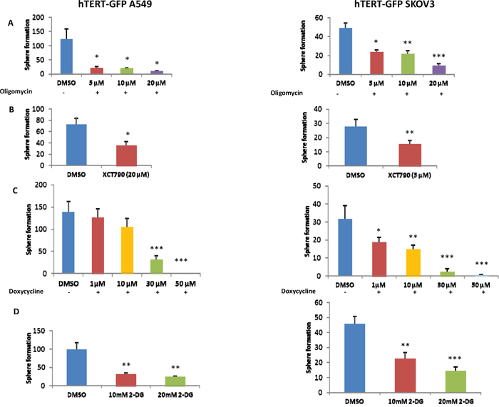 Figure 7: 3D-spheroid formation relies both on mitochondrial function and glycolytic metabolism. A-C. Mitochondrial inhibitors. Mitochondrial function is required for the efficient clonal expansion and anchorage-independent growth of CSCs. Indeed, oligomycin A, an inhibitor of the mitochondrial ATP synthase, inhibits 3D-sphere formation in the GFP(+) cell population isolated from A549 and SKOV3 cells (panel A). Complementary results were also obtained with two other well-established mitochondrial inhibitors, namely XCT790 (panel B) and doxycycline (panel C). XCT790 is a well-established ERRα inverse agonist that effectively blocks the function of PGC1A, the major mitochondrial transcription factor. Doxycycline functions as an inhibitor of mitochondrial biogenesis, by inhibiting mitochondrial protein synthesis at the level of the mito-ribosome. D. Inhibition of glycolysis. Glycolytic metabolism is important for 3D-spheroids. Note that treatment with the glycolytic inhibitor 2-deoxy-glucose (2-DG) significantly reduces sphere formation. Bar graphs show the mean ± SEM, t-test, two-tailed test. *p < 0.05, **p < 0.005, ***p < 0.001.