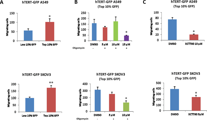 hTERT-high cells also appear to be more migratory, as observed by quantitatively comparing the migration of the GFP(+) and GFP(-) cell populations (Figure 8A). To test if this phenotype is strictly dependent on intact mitochondrial function, we examined the effects of two mitochondrial inhibitors, namely oligomycin and XCT790. Note that treatment with these mitochondrial inhibitors is sufficient to significantly reduce migration in the hTERT-high CSCs (Figure 8B, 8C).