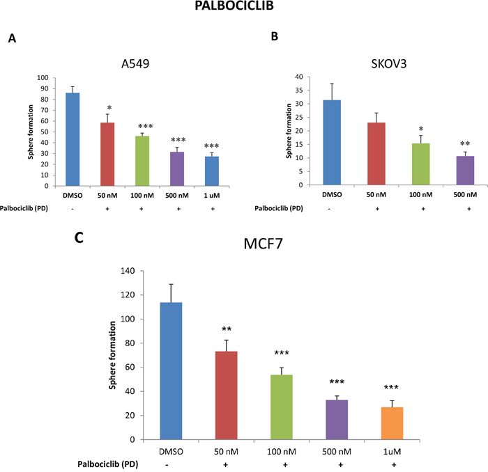 Figure 10: Targeting CSC propagation with palbociclib, a CDK4/6 inhibitor, in lung, ovarian and breast cancers. Parental A549 and SKOV3 cells were seeded in low-attachment plates and treated with the indicated concentrations of PD-0332991 (palbociclib) for five days. Then, the number of 3D-spheroids formed was quantitated. Note that palbociclib treatment very effectively inhibited 3D-sphere formation in A549 (panel A) and SKOV3 cells (panel B), with an IC-50 < 100 nM. Virtually identical results were also obtained with MCF7 cells (panel C). Data represent three independent experiments. Results are shown as the mean ± SEM, t-test, two-tailed test. Asterisk (*) depicts significant change, p<0.05. *p < 0.05, **p < 0.005, ***p < 0.0001.