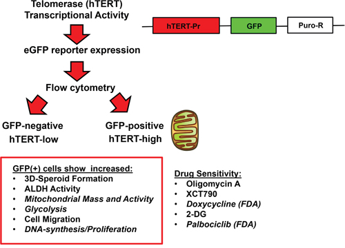 In summary, here we have used an hTERT-eGFP reporter system to study the functional role of telomerase activity in generating tumor metabolic heterogeneity. We observed that hTERT-high CSCs, are more energetically active and show an increased capacity for migration and cell proliferation. We propose several new therapeutic strategies for targeting CSCs, based on this systematic phenotypic analysis, by employing FDA-approved drugs such as doxycycline and palbociclib. These approaches mechanistically target energy metabolism and replicative immortality in CSCs.
