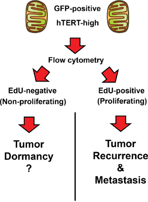 Figure 12: Telomerase-driven cancer stem-like cells: Are they also involved in tumor dormancy? Here, we observed that the hTERT-high cell population could be further divided into i) proliferating and ii) non-proliferating sub-populations, using EdU incorporation to monitor DNA-synthesis (S-phase). We speculate that the quiescent hTERT-high CSCs could be involved in tumor dormancy. See the Discussion section for further elaboration on this point.