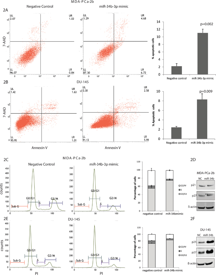 Figure 2: Effects of miR-34b overexpression on cell cycle and apoptosis of MDA-PCa-2b and DU-145 cells. MDA-PCa- 2b and DU-145 cells were transfected with miR-34b mimic or negative control. A and B. Apoptosis in MDA-PCa-2b and DU-145 cells, respectively, were measured by flow cytometric analysis of cells labeled with Annexin-V/7AAD double staining. C and D. Cell cycle distribution of MDA-PCa-2b and DU-145 cells, respectively, was analyzed by propidium iodide staining by flow cytometry. D and F. Immunoblot analysis in MDA-PCa-2b and DU-145 cells, respectively, for p21 and p27 expression.