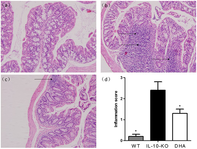 Figure 1: Changes in histological characterization and inflammation after DHA treatment in IL-10 knockout (KO) mice. Histological sections of proximal colons in mice of three groups at the end of the experiment were presented, a. Colon of WT mouse, b. IL-10 KO mice with placebo treatment and c. IL-10 KO mice with DHA treatment. The results showed that DHA-treated mice showed markedly decreased inflammatory cells infiltration and much lower mean inflammation scores d. compared with placebo-treated IL-10 KO mice. Mean values were significantly different from those of the IL-10 KO group: *P<0.05. (n=8 per group).