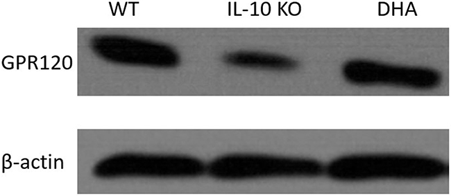 To further investigate the impact of DHA therapy on GPR120 expressions in colon tissues, we subsequently performed Western blotting analysis. As shown in Figure 3, the expression of protein GPR120 in colonic mucosa of IL-10 KO mice was significantly decreased when compared with WT mice. Interestingly, the GPR120 expression in proximal colon tissues of IL-10 KO mice was significantly up-regulated by DHA treatment. Furthermore, the impaired continuity of the distribution and depressed expression of GPR120 in colon were also observed in placebo-treated IL-10 KO mice comparing with WT mice. However, DHA intervention partly reversed this change, as shown by immunofluorescence analysis in Figure 4.