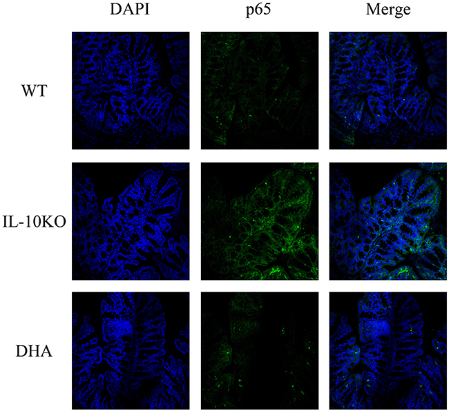 Figure 6: The expression and distribution of p65 in colon tissues. Representative immunofluorescence (green) images of p65 and nuclei (blue) of proximal colon tissues in three groups (200× magnification). DHA treatment significantly decreased the expressions of p65 in proximal colon tissues.