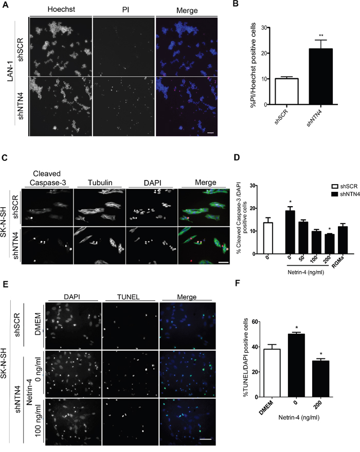 Figure 2: Silencing of NTN4 increases apoptosis in NB cells; exogenous Netrin-4 decreases this effect. A, B. Representative images of propidium iodide (PI) staining in shSCR and shNTN4 LAN-1 cell cultures. Cells were serum deprived for 24 h and stained with PI and Hoechst; cell death quantification is shown in (B) *p<0,05 shSCR v/s shNTN4. Bar: 200μm. C. Representative images of immunofluorescence against cleaved caspase-3 in shSCR and shNTN4 SK-N-SH cells. D. Quantification of cell death rescue experiments in SK-N-SH cells. Cells were treated for 24 h in serum free media adding human recombinant Netrin-4 at concentrations as described. Human recombinant RGMa (100ng/ml) was used as a control. Bar:100μm E. Representative images of TUNEL assays made in shSCR and shNTN4 SK-N-SH cells. Cells were incubated with serum free media with or without NTN4 (200 ng/ml); quantification is shown in F. *p<0,05 shSCR v/s shNTN4 (0 and 200 ng/ml). Bar:100 μm.
