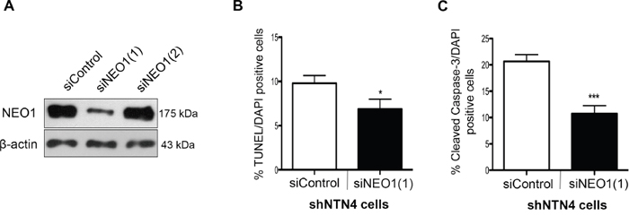 To evaluate the contribution of NEO1 in the apoptosis induced by NTN4 knock-down, we transfected siRNAs against NEO1 in shNTN4 SK-N-SH cells using Turbofect (Thermofisher) according to manufacture’s instructions. The sequences correspond to siNEO1(1) (SASI_Hs02_00333957) and siNEO1(2) (SASI_Hs01_00151269) and, siControl (SIC002) provided by Sigma Aldrich. siRNA efficiency was evaluated through Western blot against NEO1. Briefly, 1μg of siRNA was transfected into shNTN4 cells and 48 h later, cells were serum deprived for 48h and fixed with PFA 4%. Apoptosis was evaluated via TUNEL and immunofluorescence of Cleaved-Caspase-3. The assays were analyzed by fluorescence microscopy using an Olympus BX- 51 microscope. Positive cells and DAPI positive cells were counted and the ratio between both quantifications was graphed as a percentage. The assays were made by 30 replicates for each condition and two independent experiments were realized for each assay.