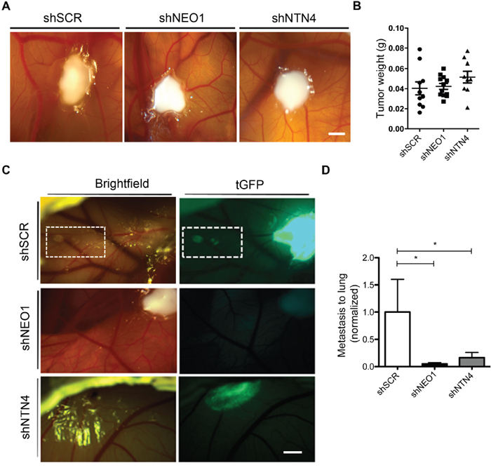 Fertilized chicken eggs were incubated at 37.5°C with constant humidity. On the second day of incubation (E2), 2 mL of albumin was removed from the egg. On day four (E4), a rounded window was made in the shell in order to have access to the chick chorioallantoic membrane (CAM), and sealed with adhesive tape. On day ten of incubation (E10), ten million SK-N-SH shNEO1, shNTN4, or shSCR cells were drop-plated on the developing CAM. On day 17 of incubation (E17), the primary tumor of the CAM was weighed and the embryo was dissected. Embryonic lungs were incubated with RNASolv (OmegaBiotek) and kept at -20°C. We extracted genomic DNA following the manufacturer’s instructions. Genomic DNA expression levels were analyzed via qPCR analysis using human Alu sequences (FW: 5’ACG CCT GTA ATC CCA GCA CTT3’; RV: 5’TCG CCC AGG CTG GAG TGC A3’) and genomic chicken GAPDH (FW: 5’GAG GAA AGG TCG CCT GG3’; RV: 5’GGT GAG GAC AAG CAG TGA3’) primers. The analysis was made using fold change with respect to chGAPDH and normalized according to lung of control cells (shSCR). Five eggs were used for each condition.