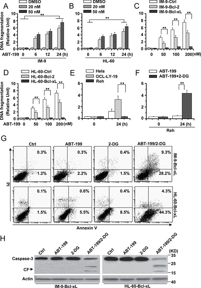 Figure 1: 2-DG combined with ABT-199 induces cell apoptosis in hematopoietic cancer cells with excessive Bcl-xL expression. (A) and (B) Analysis of cell apoptosis treated with ABT-199. IM-9 and HL-60 cells were treated with indicated concentrations of ABT-199 for different periods of time and then collected to examine apoptosis. Cell apoptosis was quantitatively detected by a cell death ELISA kit as described in Materials and methods. Graphs showing results of quantitative analyses (n = 3, mean ± S.D. **P < 0.01); (C) IM-9 cells were stably transfected with Ctrl, Bcl-2 or Bcl-xL vector and then treated with different concentrations of ABT-199 for 24 h. Treated cells were lysed for apoptosis detection as described in A. Graphs showing results of quantitative analyses (n = 3, mean ± S.D. **P < 0.01); IM-9-Bcl-2 or IM-9-Bcl-xL refer to overexpressing Bcl-2 or Bcl-xL IM-9 cells. (D) HL-60 cells were stably transfected with Ctrl, Bcl-2 or Bcl-xL vector and then treated as described in C. Graphs showing results of quantitative analyses (n = 3, mean ± S.D. **P < 0.01); HL-60-Bcl-2 or HL-60-Bcl-xL refer to overexpressing Bcl-2 or Bcl-xL HL-60 cells. (E) Indicated cells were treated with ABT-199 (50 nM) for 24 h, and then treated cells were collected for apoptosis detection. Graphs showing results of quantitative analyses (n = 3, mean ± S.D. **P < 0.01). (F) Reh cells were treated with ABT-199 (50 nM) or ABT-199 (50 nM) with 2-DG (5 mM) for 24 h. Treated cells were collected for apoptosis detection. Graphs showing results of quantitative analyses (n = 3, mean ± S.D. **P < 0.01). (G) Indicated cells were treated with 2-DG, ABT-199 (50 nM) or the combination of the two (2-DG, 5 mM; ABT-199, 50 nM) for 24 h, and then collected for Annexin V and PI double staining with flow cytometry. (H) Cells were treated as describe in G for 24 h, and then lysed for western blot detection. β-Actin was used as a protein loading control. Representative results of three experiments with consistent results are shown.