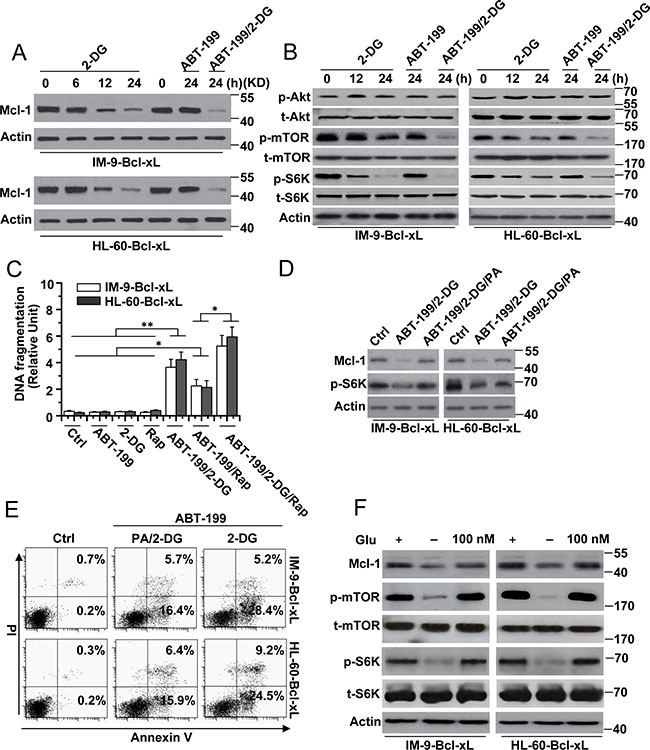 Figure 2: The reduction of Mcl-1 expression is indispensable for cell apoptosis by 2-DG with ABT-199 treatment. (A) Cells were treated with 2-DG (5 mM), ABT-199 (50 nM) or the combination of the two (2-DG, 5 mM; ABT-199, 50 nM) at the indicated time points, and then lysed for western blot detection. β-Actin was used as a protein loading control. (B) Cells were treated as described in A and analyzed for immunoblot. (C) Cells were treated with 2-DG (5 mM), ABT-199 (50 nM), rapamycin (25 nM) or the indicated combination treatment for 24 h. Treated cells were collected for apoptosis detection. Graphs showing results of quantitative analyses (n = 3, mean ± S.D. *P < 0.05; **P < 0.01). (D) Cells were subjected to the indicated combination treatment (2-DG, 5 mM; ABT-199, 50 nM; PA, 100 μM) for 24 h, and then lysed for immunoblot detection. (E) Cells were treated as described in D and then collected for Annexin V and PI double staining with flow cytometry. (F) Cells were culture in glucose-free RPMI-1640 media as indicated for 24 h, and then added 100 nM glucose for 24. Treated cells were analyzed for immunoblot. All data are representative of three independent experiments.