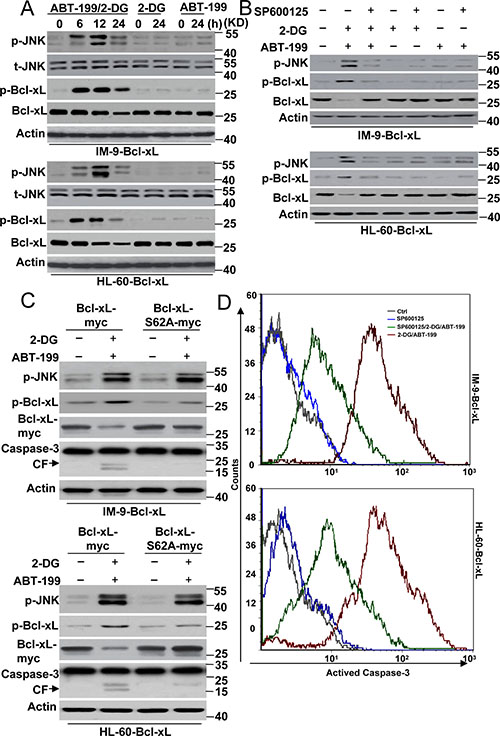 Figure 3: JNK mediated Bcl-xL degradation contributes to cell death by 2-DG with ABT-199 treatment. (A) Cells were treated with 2-DG (5 mM), ABT-199 (50 nM) or the combination of the two (2-DG, 5 mM; ABT-199, 50 nM) at the indicated time points, and then lysed for western blot detection. β-Actin was used as a protein loading control. (B) Cells were treated with 2-DG (5 mM), ABT-199 (50 nM), SP600125 (20 μM) or the indicated combination treatment for 24 h, and then lysed for western blot detection. (C) Cells were transfected with Bcl-xL-Myc or Bcl-xL-S62A-Myc for 48 h, and then cells were treated with 2-DG and ABT-199 for 24 h. Treated cells were lysed for immunoblot detection. (D) Cells were treated as described in B, and then collected for caspase-3 activity detection with a special antibody for cleaved caspase-3 (#9664, Cell Signaling) by flow cytometry. Representative results of three experiments with consistent results are shown.