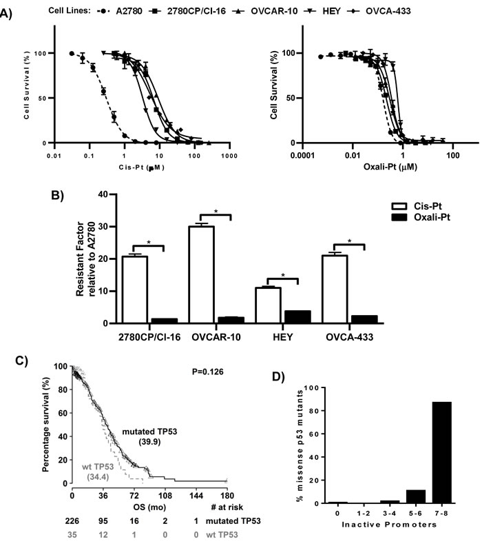Figure 1: Cytotoxic drug response in cell lines and overall survival of patients based on p53 status. A. Dose-response curves for cis-Pt and oxali-Pt in A2780, 2780CP/Cl-16, OVCAR-10, HEY and OVCA-433 cell lines using the 5-day MTT assay. B. Resistance factors of 2780CP/Cl-16, OVCAR-10, HEY and OVCA-433 cell lines relative to A2780 cells. *p ≤ 0.05 by Student’s t-test. N = 3; Mean ± SD. C. Survival analysis of HGSOC patients based on p53 status. The Log-rank test was used to determine statistical significance; p ≤ 0.05. D. Analysis of predicted functional activity of p53 missense mutants found in HGSOC patients. The numbers of target gene promoters not responsive to mutant p53 are shown. The percentages of total p53 mutants failing to activate the specific number of target gene promoters are shown.