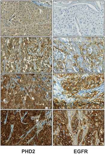 Since clinical studies support an important link between intratumoral hypoxia and upregulation of EGFR, we were interested to see whether there is a correlation between the major HIF-1α negative regulator PHD2 and EGFR levels. By analyzing PHD2 and EGFR expression in TMAs of tumor biopsies from 313 human breast cancer patients, we found that PHD2 showed a positive and significant correlation to EGFR expression (correlation coefficient = 0.231, p<0.001; n=313). In line with earlier studies, no significant correlations were found between PHD2 protein levels and HER2, ER or PR [15]. Representative immunological stainings illustrating the expression patterns of PHD2 (cytoplasmic) and EGFR (membranous) and the correlation of both proteins are shown in Figure 1.