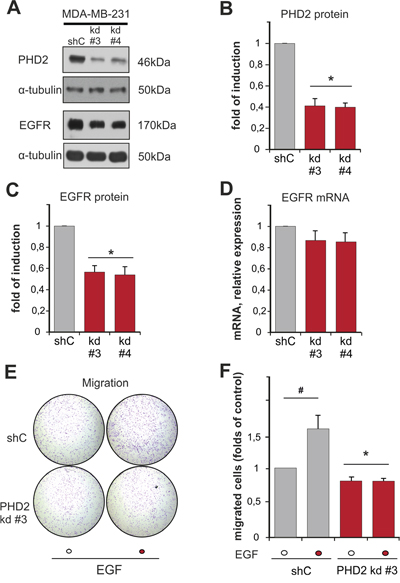 Figure 3: Knockdown of PHD2 in MDA-MB-231 cells affects EGFR levels and EGF-driven motility. A. Representative immunoblots of PHD2 and EGFR levels in the lysates of MDA-MB-231 shC control and PHD2 knockdown clones #3 and #4. B, C. Quantification of PHD2 levels (B) and EGFR levels (C) in MDA-MB-231 cells. The PHD2 and EGFR levels in the shC (respective control) were set to 1. * significant difference between PHD2 and EGFR levels in the knockdown clones #3 and #4 vs. control. D. Quantification of EGFR mRNA levels in MDA-MB-231 cells. The EGFR mRNA levels in the shC (respective control) were set to 1.* significant difference between EGFR mRNA levels in the PHD2 knockdown clones #3 and #4 vs. control. E. MDA-MB-231 shC control and PHD2 knockdown cells #3 were treated with either vehicle or with EGF (100 ng/ml) for 2 days and cell migration was analyzed in a transwell migration assay. Representative photographs of the whole cell culture insert field from the migration assay. F. Quantification of the transwell migration assay. The number of migrated non-treated shC control cells was set to 1 (respective control). * significant difference between PHD2 knockdown cells vs. control. # significant difference EGF-treated cells vs. non-treated. In all experiments more than 500 cells were scored. Results are presented as mean values of three independent experiments ± SD. The statistical comparison between groups was performed by using Student’s two-tailed t-test. *p ≤ 0.05.