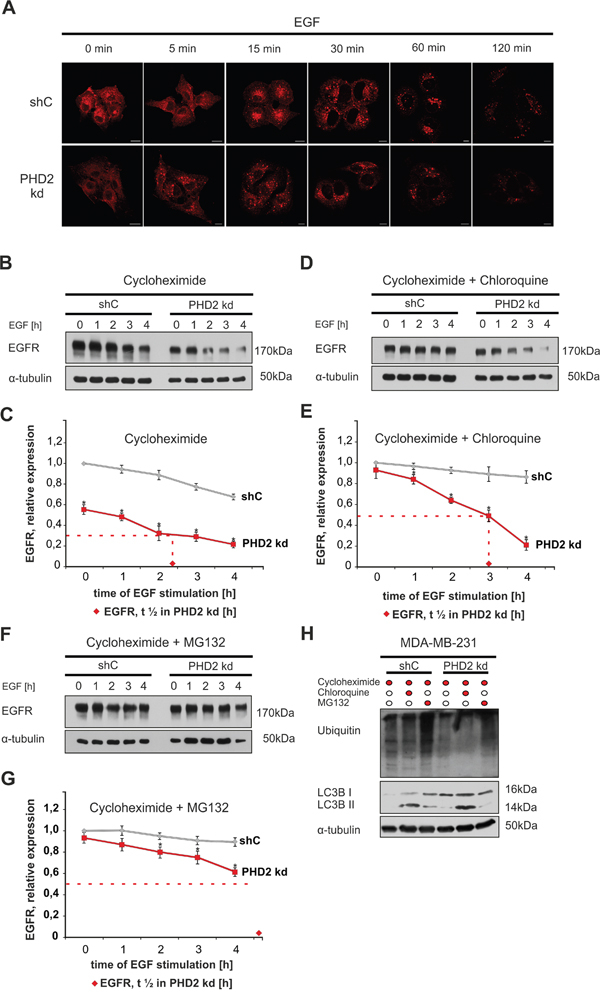MDA-MB-231 shC and PHD2 knockdown #3 cells (2x105 cells per plate) were plated on 6 cm dishes and cultured for 1 day in full serum. 16 h before treatment, the cells were cultured in starvation medium (DMEM containing 0.1% FBS), supplemented with either cycloheximide (10 mM), or cycloheximide (10 mM) together with the lysosome inhibitor chloroquine (100 mM) for 16 h. To inhibit the proteasome, the cells were starved and pre-treated with cycloheximide for 16 h, followed by 2 h pre-treatment with MG132 (10 mM). Afterwards the cells were treated with EGF (100 ng/ml) for 0, 1, 2, 3 and 4 h, cell lysates were prepared as described above. To verify lysosomal and proteasomal inhibition, lysates from treated cells were checked for accumulation of LC3B II (#2775, Cell Signaling) and ubiquitin (sc-9133, Santa Cruz).