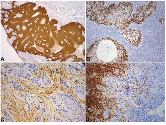 Figure 1: Representative immunohistochemical sections. A. CD3 heavily infiltrated carcinoma. At the left of the image, front compartment. At the right, intense stromal infiltration. DAB x 100. B. CD4 moderately infiltrated carcinoma-stromal and intraepithelial compartment. DAB x 100. C. CD57 moderately infiltrated front compartment with sporadic cells in the stromal compartment. DAB x 100. D. Rare staining of lymphocytes for granzyme b in the intraepithelial compartment. DAB x 400.