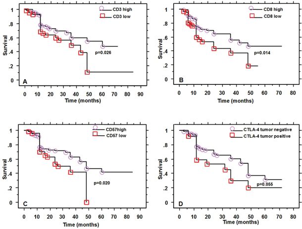 Certain markers were associated with tumor localization: CD57 higher density was seen in oropharyngeal tumors (p=0.0007), CD4 lower density was seen in laryngeal tumors (p=0.03) and lower CTLA4 tumor cell expression in laryngeal carcinomas (p=0.04).