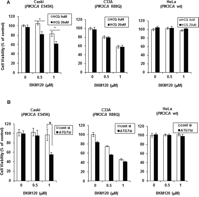 Figure 1: Autophagy inhibition improves PI3K inhibitor efficacy in PIK3CA-mutant cervical cancer cells in a context-dependent manner. A. Indicated cell lines were seeded in 96-well plates and treated the next day with BKM120 (0.5 and 1 μM) alone or in combination with 20 μM HCQ for 72 h. Cell viability was measured by an MTS-based assay. Columns, means of six replicate determinations; bars ± SD; *P < 0.01. B. Indicated cell lines were transiently transfected with ATG7-specific siRNA and then treated with 0.5 μM or 1 μM BKM120 for 72 h. Columns, means of six replicate determinations; bars, ± SD; *P < 0.01.